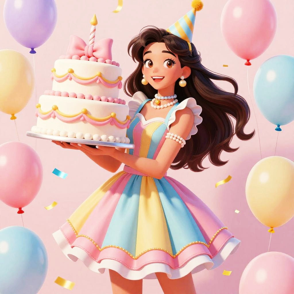 Big cake girl wearing a colorful party dress, holding a giant layered cake, surrounded by balloons and confetti, vibrant pastel colors, festive atmosphere, detailed character art