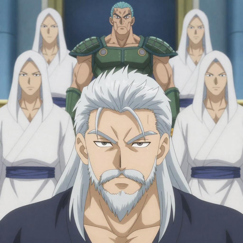 Digital anime-style illustration of an intense close-up of a white-haired, bearded man with a stern expression in the foreground. In the background, a muscular man with green armor stands center, surrounded by four white-robed figures. Bright blue and white environment with a dark entrance.