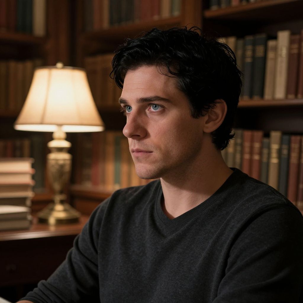 Photograph of a young man with curly dark hair, wearing a black long-sleeved shirt, deeply focused on a chessboard. He is seated at a wooden table in a dimly lit room, with sunlight streaming through a window in the background. His right hand is poised to move a black chess piece. The chessboard features a mix of black and white pieces, with the pieces casting shadows on the table's surface. The background is slightly blurred, showing indistinct furniture and a framed picture on the wall. The overall mood is intense and contemplative.