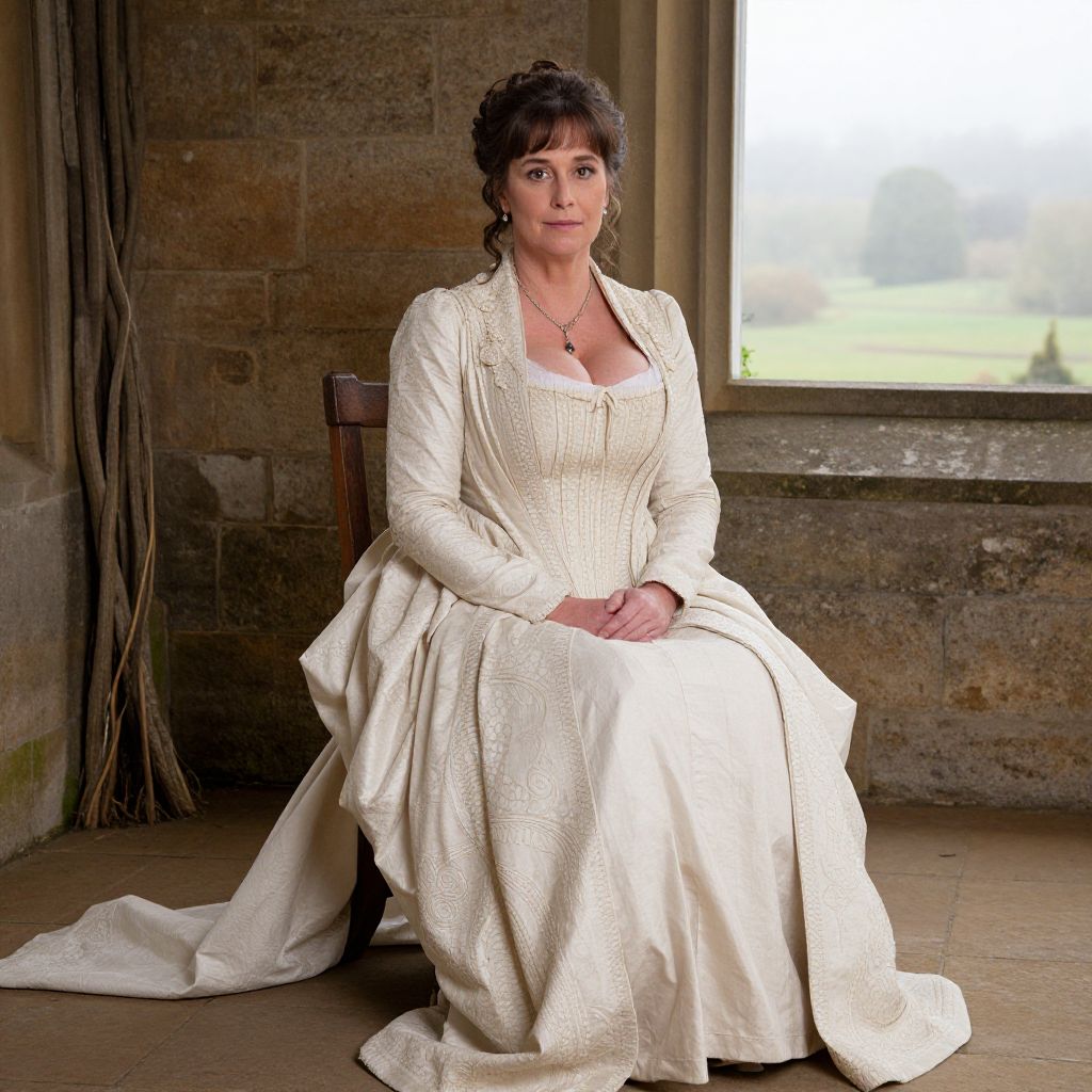 A vividly realistic photograph of a middle-aged Victorian woman in full period costume, wearing a cream-colored dress with intricate beading, a structured bodice, and a long train, sitting on a wooden chair at a grand country estate, the setting includes a stone garden wall and a window revealing a foggy landscape, her face has a serene expression with warm brown eyes and a thoughtful brow.. The woman has big breasts and cute face
