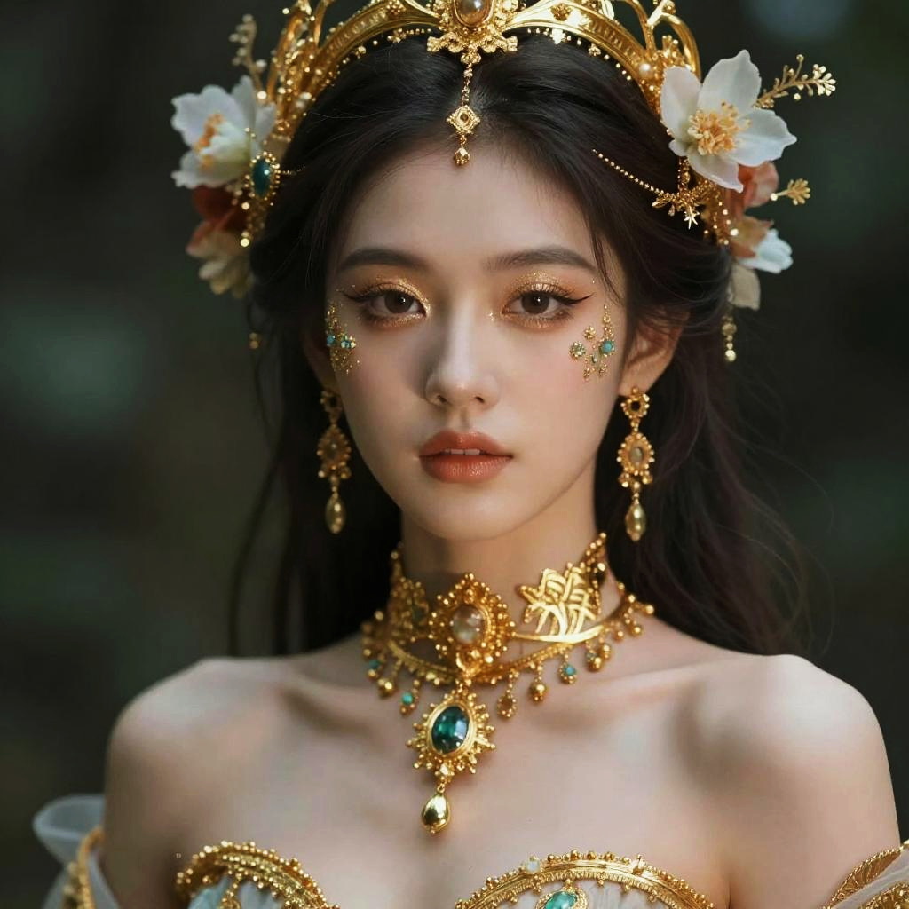 This striking portrait features a woman adorned with intricate golden embellishments, embodying a fusion of nature and art. Her ethereal beauty is complemented by stylized makeup and delicate floral accents, creating a dreamlike atmosphere that captivates the viewer. The artwork showcases a blend of realism and fantasy, highlighting the artistic craftsmanship involved.