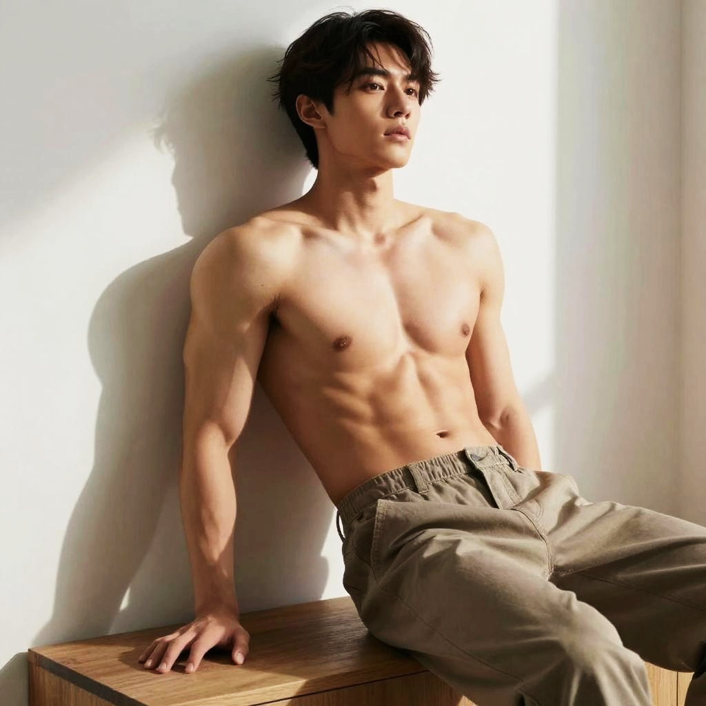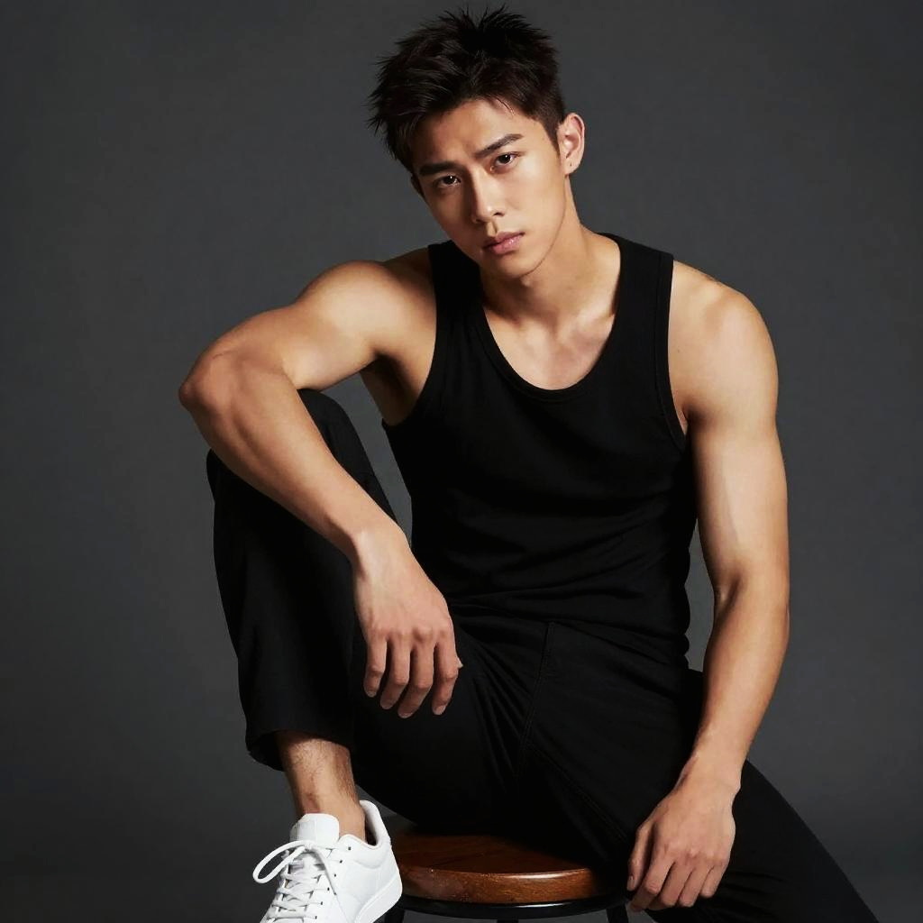 Photograph of a young, muscular Asian man with short, spiky black hair, sitting against a dark gray background. He wears a black sleeveless tank top, black pants, and white high-top sneakers. His right arm rests on his knee, and his left hand is placed on a wooden stool in front of him. He has a serious expression, with piercing brown eyes looking directly at the camera. The lighting highlights his toned arms and chest, creating a slight contrast with the dark background. The overall style is modern and edgy, with a focus on the subject's athletic build and confident demeanor.