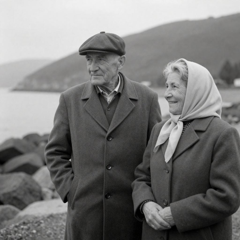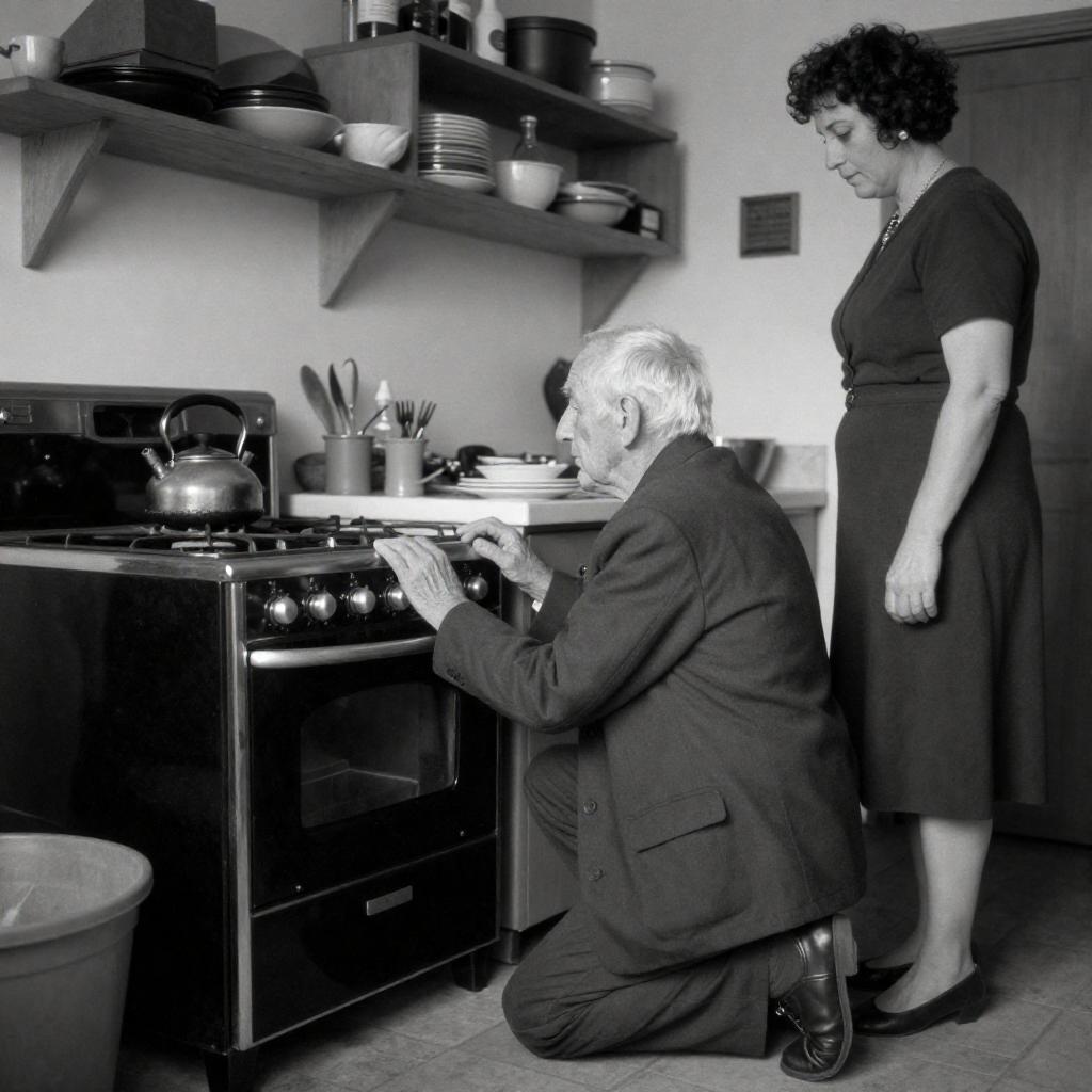 Black-and-white photograph of an elderly man with white hair, wearing a dark jacket and pants, kneeling beside a vintage stove in a cluttered kitchen. A middle-aged woman with short curly hair, in a dark dress and heels, stands nearby, looking at him. The kitchen has shelves filled with dishes and bottles, and a kettle on the stove.