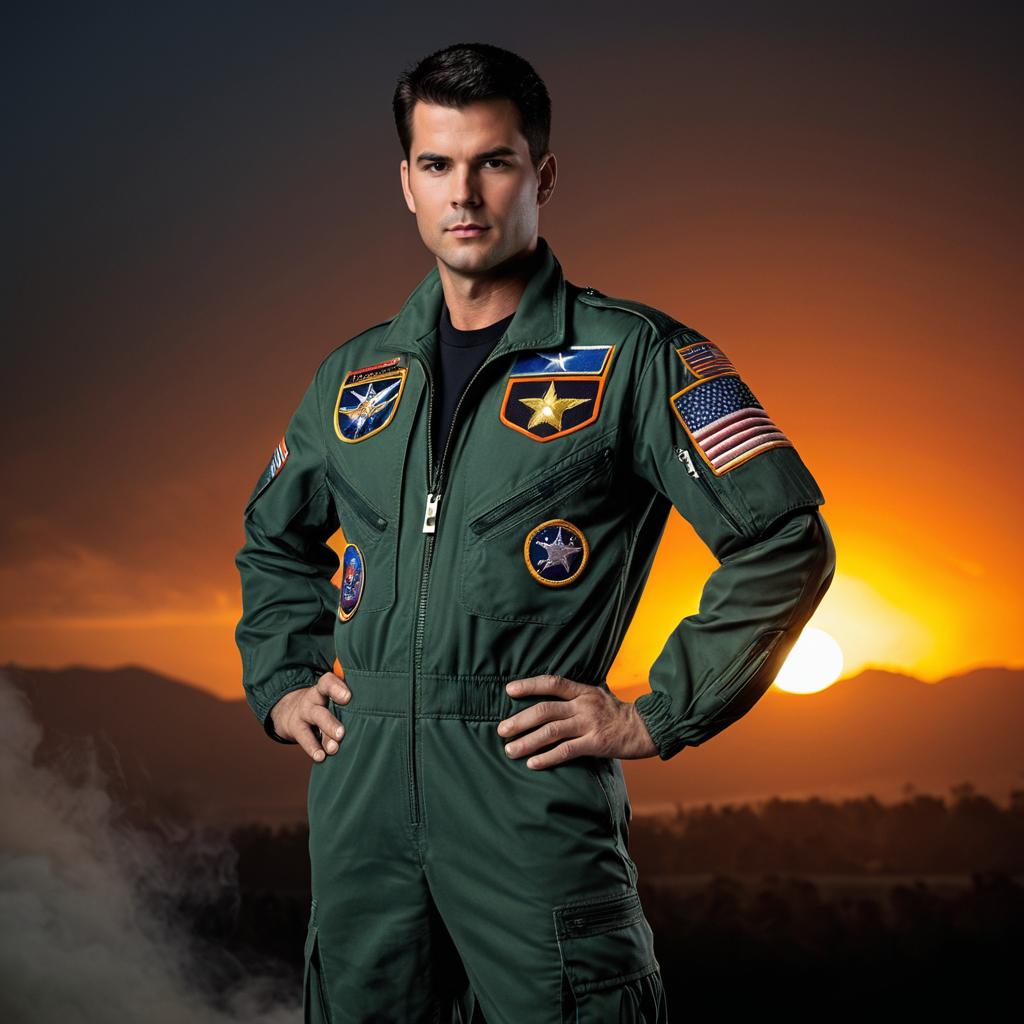 Man in Military Pilot Flight Suit at Sunset