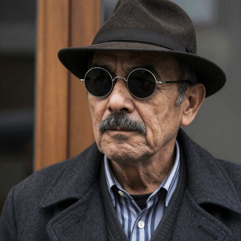 Middle-aged man with gray hair, light skin, and wrinkles, wearing a beige jacket and black pants, sits against a green ured wall. He raises his right hand with fingers spread, smoking a cigarette. A tan lampshade is on a radiator to his right. Intense, focused expression.