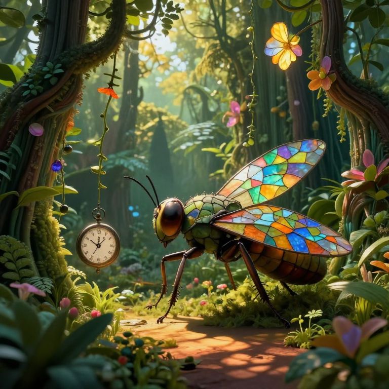 In the surrealistic vein of an enigmatic garden scene, visualize an insect's unique perspective transforming vibrant flora into abstract geometric forms, reminiscent of impossible structures. The foreground showcases a gently drifting timepiece, its hands suspended amidst towering, textured foliage and blooming vines with luminescent petals that gleam like stained glass. This dreamlike composition juxtaposes the enchantment and complexity of nature, using soft greens and warm golden light filtering through verdant growth to cast elongated shadows across the ground in an emotional spectrum signifying the transient nature of existence.