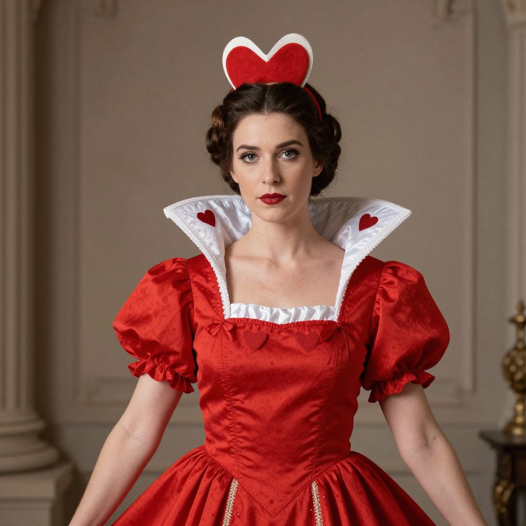 Photograph of a woman in a red, puffed-sleeve, heart-patterned Alice in Wonderland costume with white collar and red bow, standing
