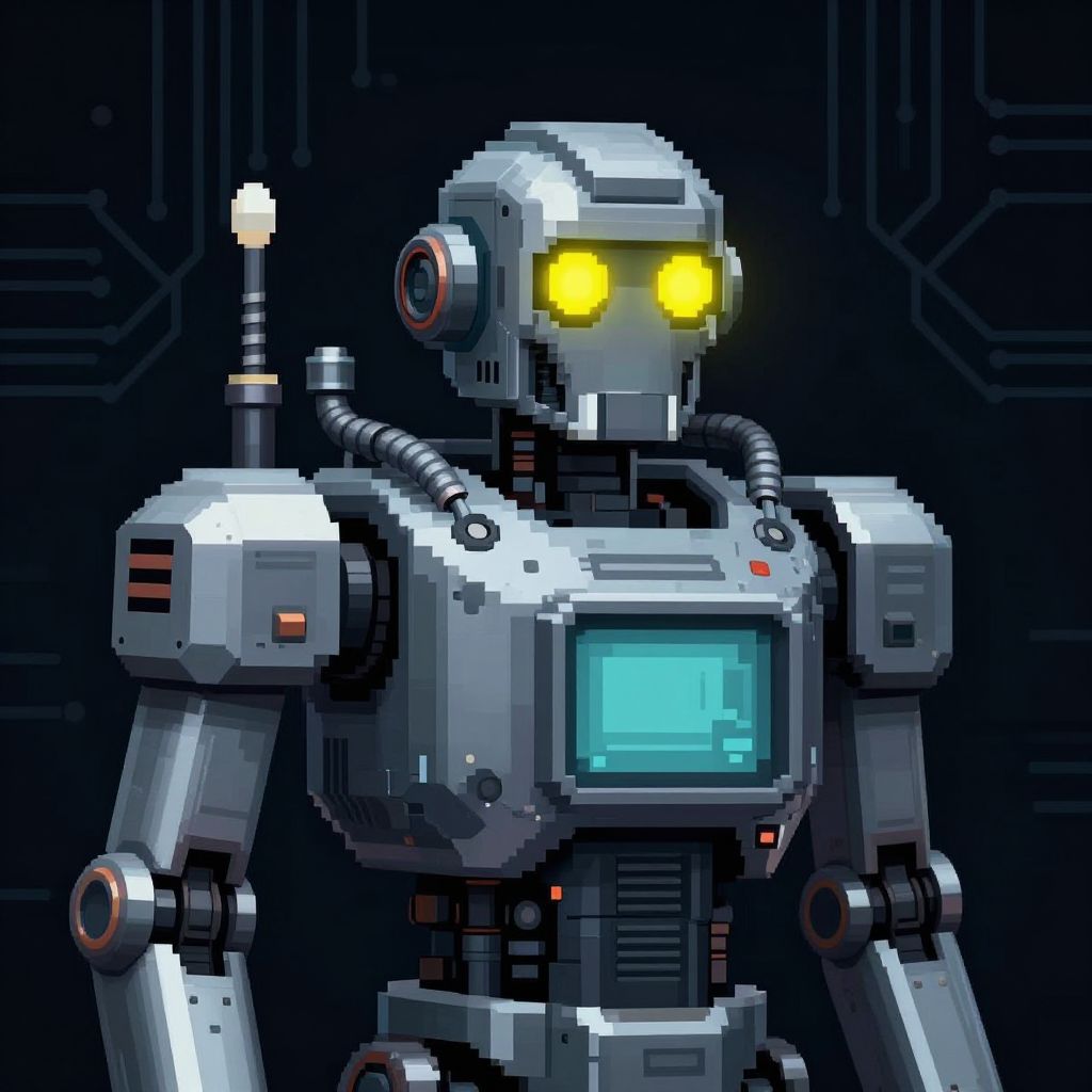 Pixel art of a metallic, humanoid robot with glowing yellow eyes, a blue screen, and black background with circuit patterns.