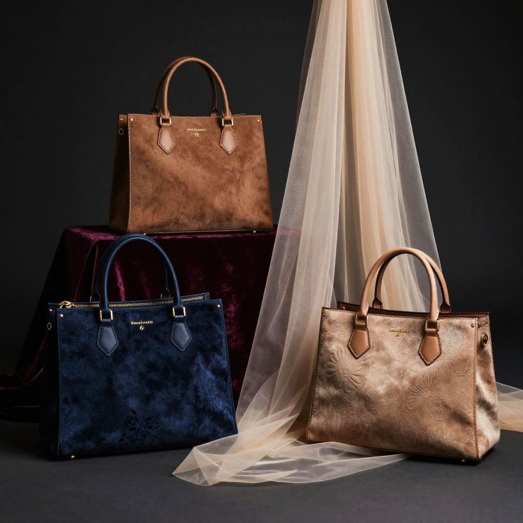 Photograph of three luxury handbags displayed against a dark background. The handbags are arranged in a triangular formation, with a sheer, white fabric draping over the center bag, which is a metallic gold color. To the left, a black handbag with a subtle blue marbled pattern sits on a dark, velvet-covered pedestal. To the right, a medium-brown handbag with a smooth, leather texture stands upright. All bags have short, rounded handles and are illuminated with soft, dramatic lighting, highlighting their textures and colors. The overall composition is elegant and sophisticated.