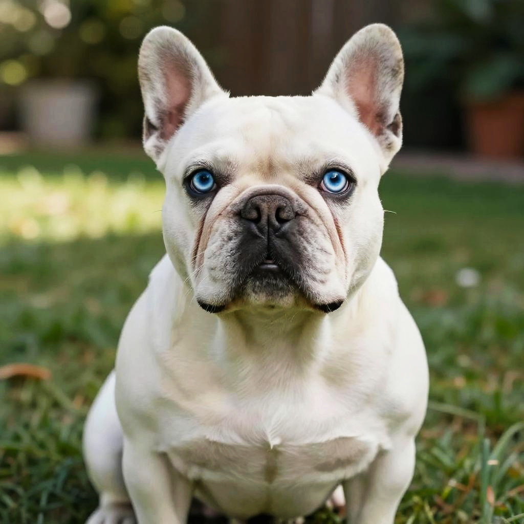 French bulldog white blue eyes portrait, close-up, detailed fur texture, sparkling blue eyes, vintage sepia background, soft shadows and warm highlights
