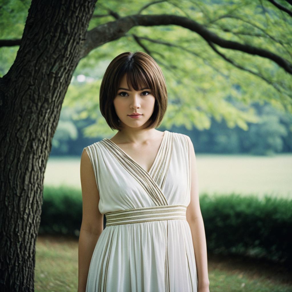 Linen party dress,1girl, solo, realistic, dress, white dress, black hair, photorealistic, long sleeves, short hair