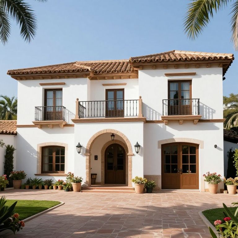 Photograph of a two-story Spanish-style house with white stucco walls and a terracotta tile roof. The house features two black iron balconies, one on the second floor and one above the arched front entryway. The entryway has a large wooden door with a semi-circular transom window. Flanking the door are two black lantern-style lights. Potted plants line the tiled driveway, which leads to the front door. The bright blue sky and palm fronds in the background enhance the sunny, Mediterranean ambiance.