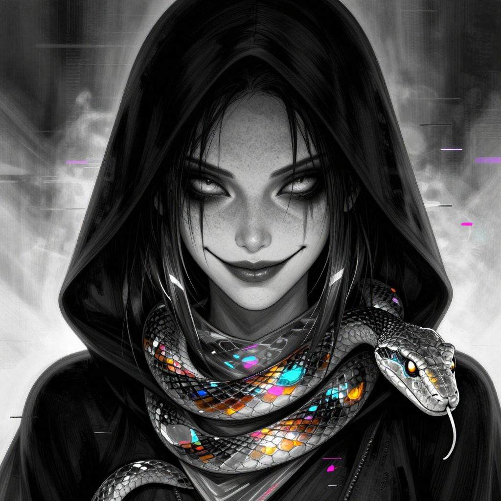 This digital artwork features a mysterious, monochromatic woman with pale skin, dark eyes, and black lips, wearing a hooded cloak. Her face is slightly shadowed, giving a sinister yet captivating expression. Wrapped around her neck is a vividly colored snake with iridescent scales, displaying bright blues, reds, and yellows. The background is a grayscale, smoky texture with digital glitch effects, adding a futuristic and eerie atmosphere. The overall style is dark, gothic, and surreal, with a high-contrast color palette emphasizing the contrast between the woman's dark attire and the snake's vibrant scales.