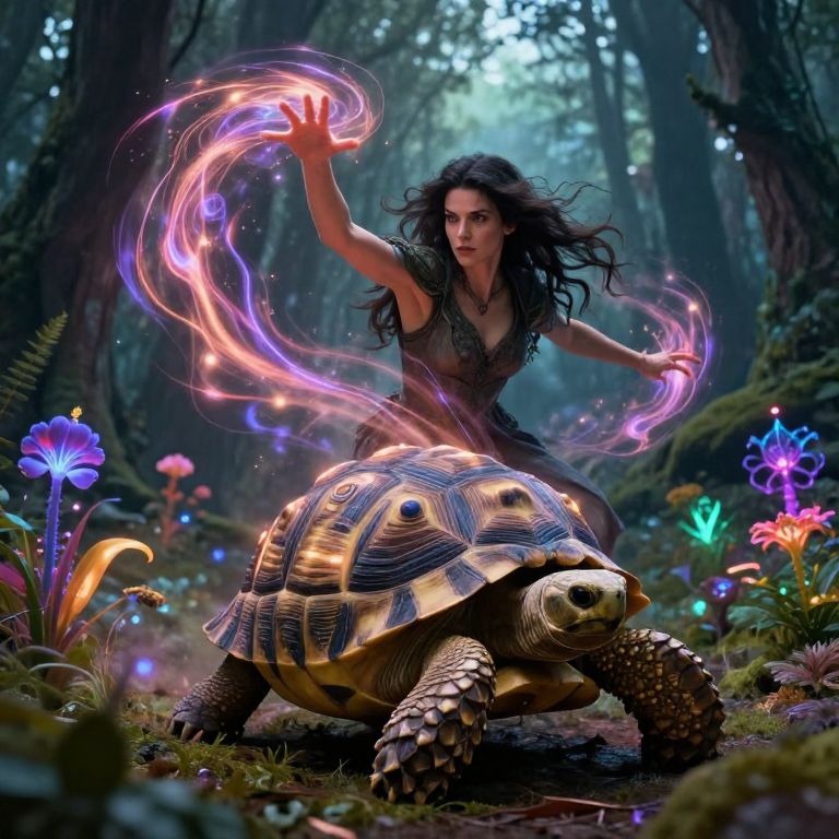 Digital artwork: Dark-haired woman with glowing purple magic swirls over enchanted forest, beside a detailed, glowing turtle with vibrant patterns.