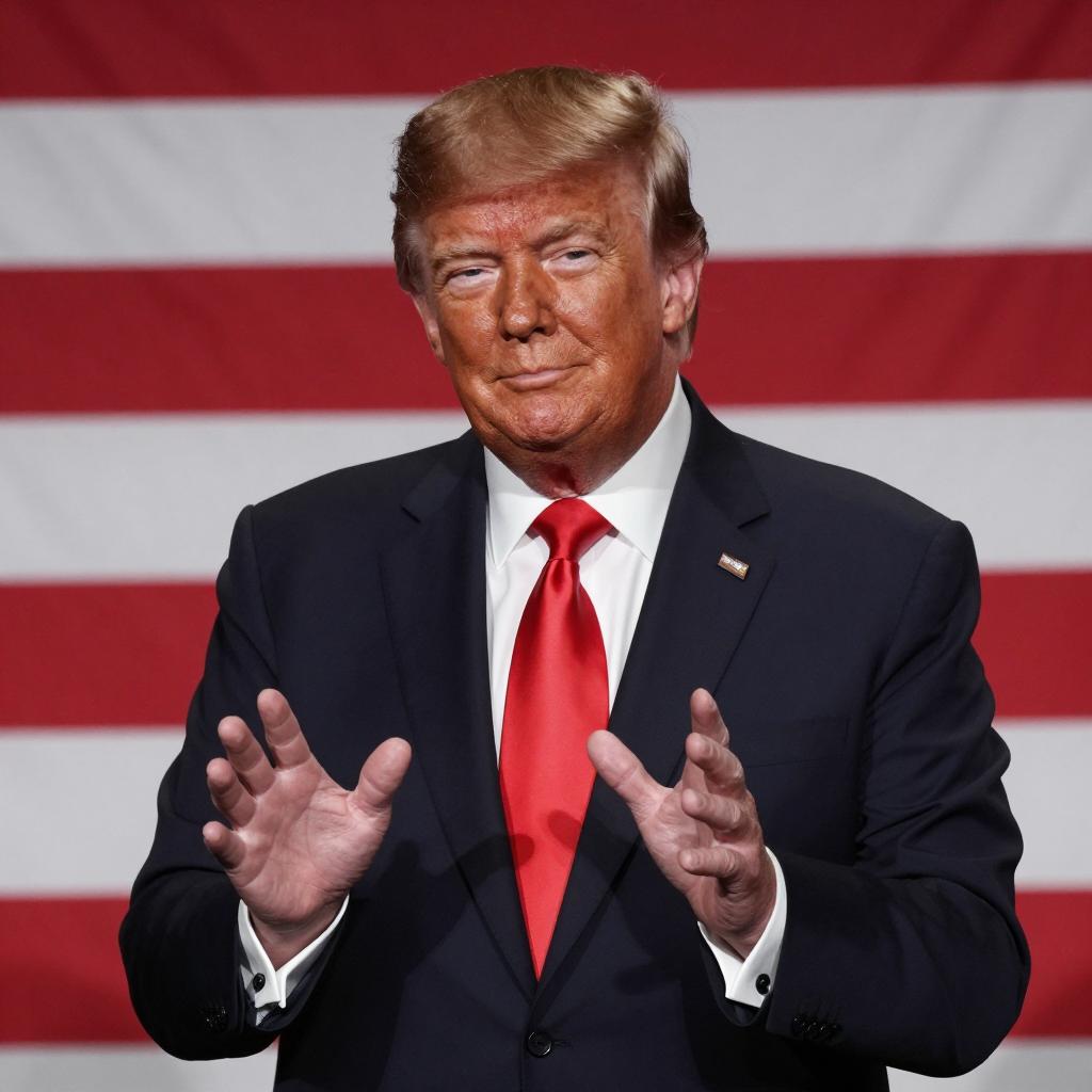 Mid-30s man with light skin and brown hair, wearing a black suit, white shirt, and red tie, gestures with both hands. He smiles slightly. Background has a large, horizontally striped American flag with red and white stripes. Light shines from the right, casting shadows on his face.