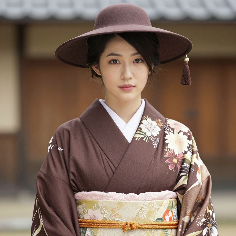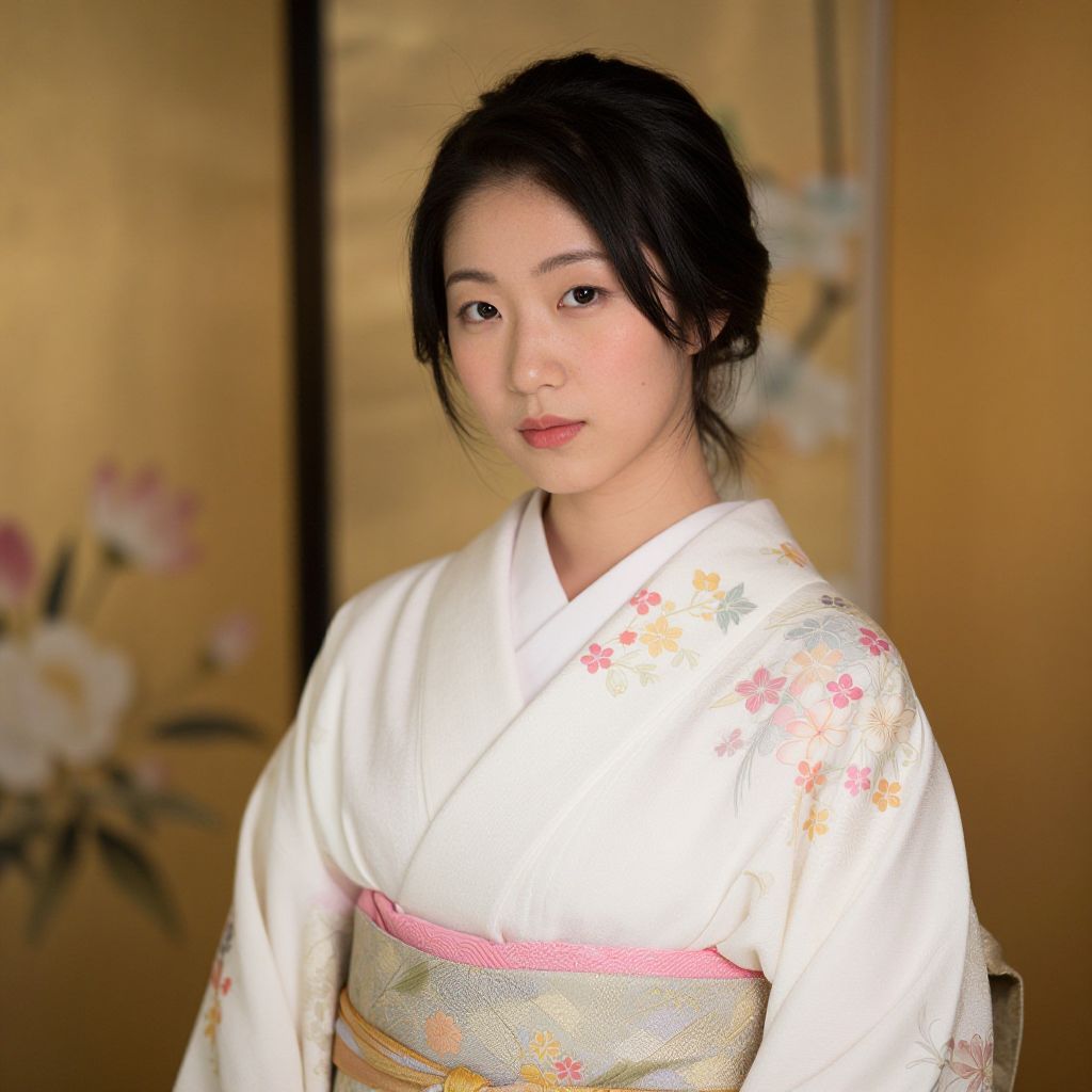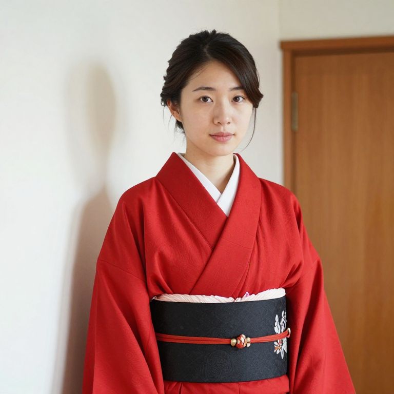 Female wearing a red kimono with gold embroidery and a white shirt.