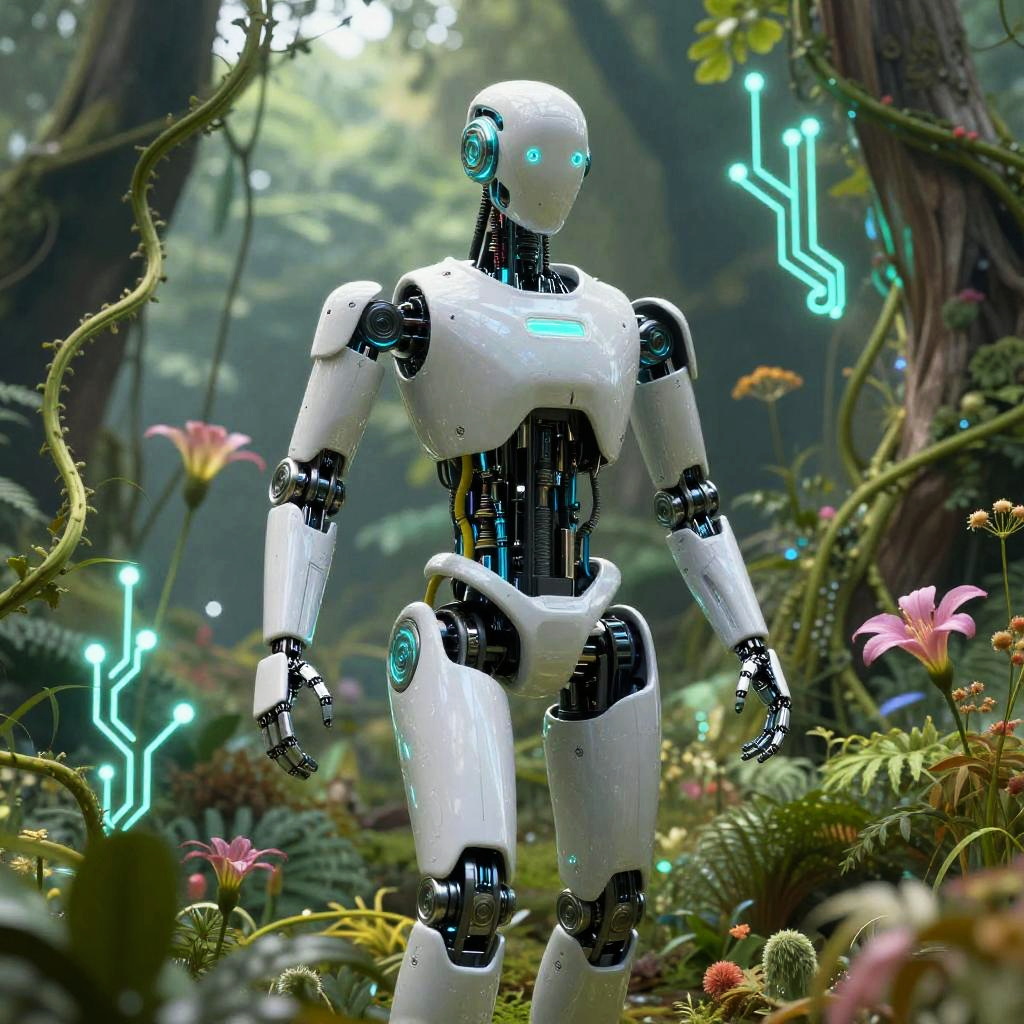 AI generated video art portraying a surreal fusion of humanoid robots and digital flora, glowing vines and circuit branches, animated with fluid movement and ethereal lighting, creating a harmonious coexistence of nature and AI