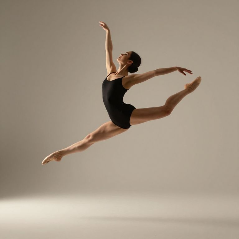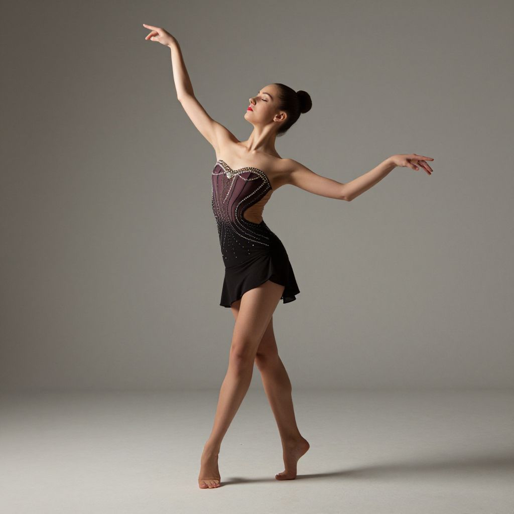 Photograph of a graceful ballet dancer in a black, strapless, beaded dress, standing on one leg, arms raised, against a grey background