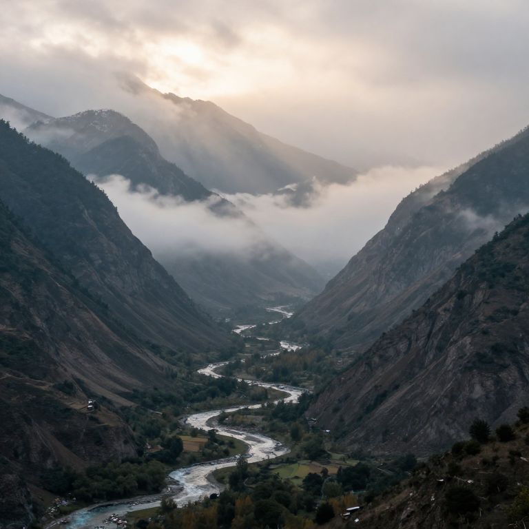 A photograph of a misty mountain valley at dawn. Dark, forested mountains with rocky textures frame a winding river that snakes through the valley, reflecting light. White, fluffy clouds hover above, partially obscuring the sun. The valley floor is dotted with sparse trees and patches of green grass. The sky is overcast, with diffused sunlight creating a soft, ethereal glow. The image captures a serene and majestic natural landscape, emphasizing the contrast between the dark mountains and the bright, misty atmosphere.