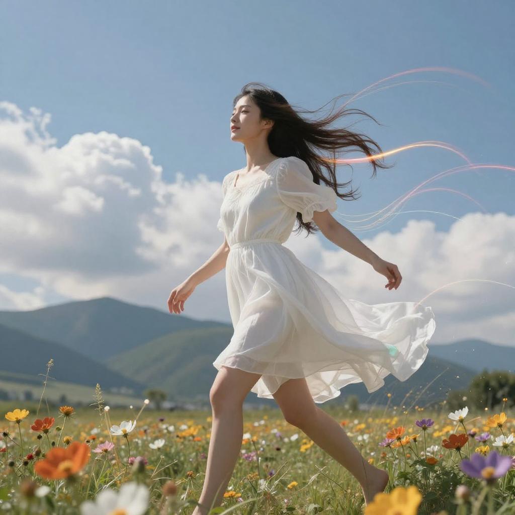A young woman in a flowing white dress sits gracefully on a beach during sunset, holding a bouquet of soft pink and white flowers. The serene background features gentle waves and distant mountains under a pastel pink sky, creating a romantic and peaceful atmosphere.