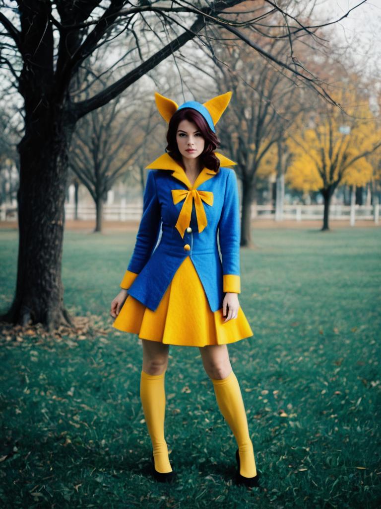 A woman standing outdoors in a park wearing a vibrant blue and yellow felt costume with a bow tie and cat-like ears on the hood. She has dark hair styled in loose waves and wears matching yellow knee-high socks and black shoes. The autumn background features bare trees and a green grassy area.