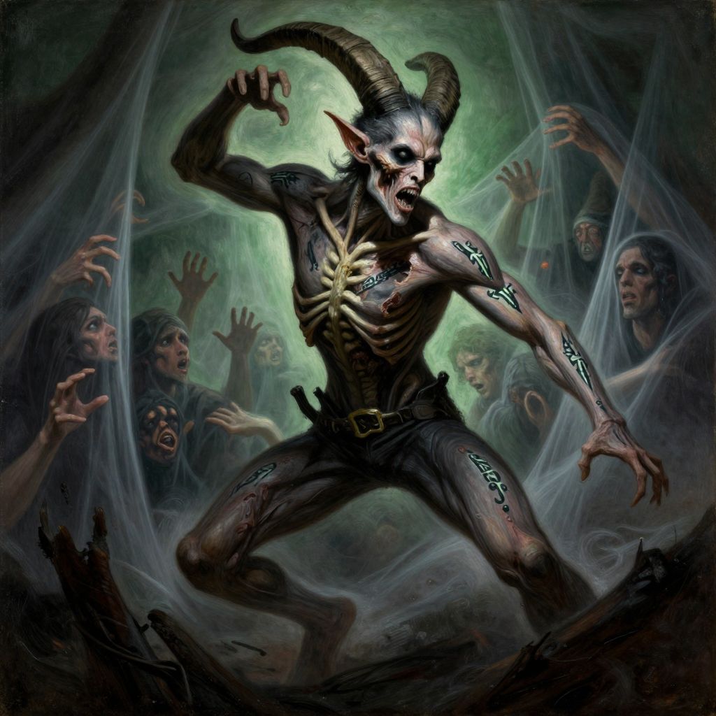 2 tones, black and greenish, adpat for 2 wide screens wallpaper action pose, action position a painting by frank frazetta and jeremy mann oil painting style, main character emaciated, skinny rickety, skin on bones, skin decomposing, emaciated, cowboy photoshot, dynamic position, action pose, view from low ribs to top horns A horrifying vision of an illustration of a demonic entity exuding terror and majesty, From the base of its exposed ribcage to the towering goat-like horns, its upper body is muscular yet grotesque, with areas where its ribs pierce through decaying flesh, and its skin appears torn and ragged, Its lower body is emaciated, skeletal, and haunting, with sinews clinging to bone, The demon's eyes are pure black voids, radiating malice, and its skin is marked with glowing, intricate runic tattoos that pulse with dark energy, Its hands are positioned in an elegant yet menacing manner, emphasizing its unnatural poise, The background is a macabre scene of tortured souls, seemingly trapped behind a translucent, ghostly veil, Faces and hands press against the fabric of the veil, their expressions of agony and despair visible as they struggle to break free, The atmosphere is thick with darkness and ethereal mist, enhancing the demon's ominous presence and creating a chilling, otherworldly setting