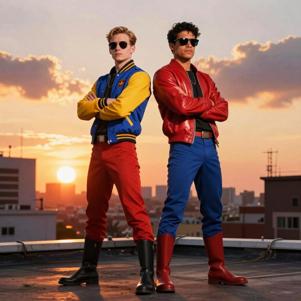 Back to back arms crossed pose, stylish superheroes standing on a rooftop at sunset, comic book style, bold colors, dynamic composition