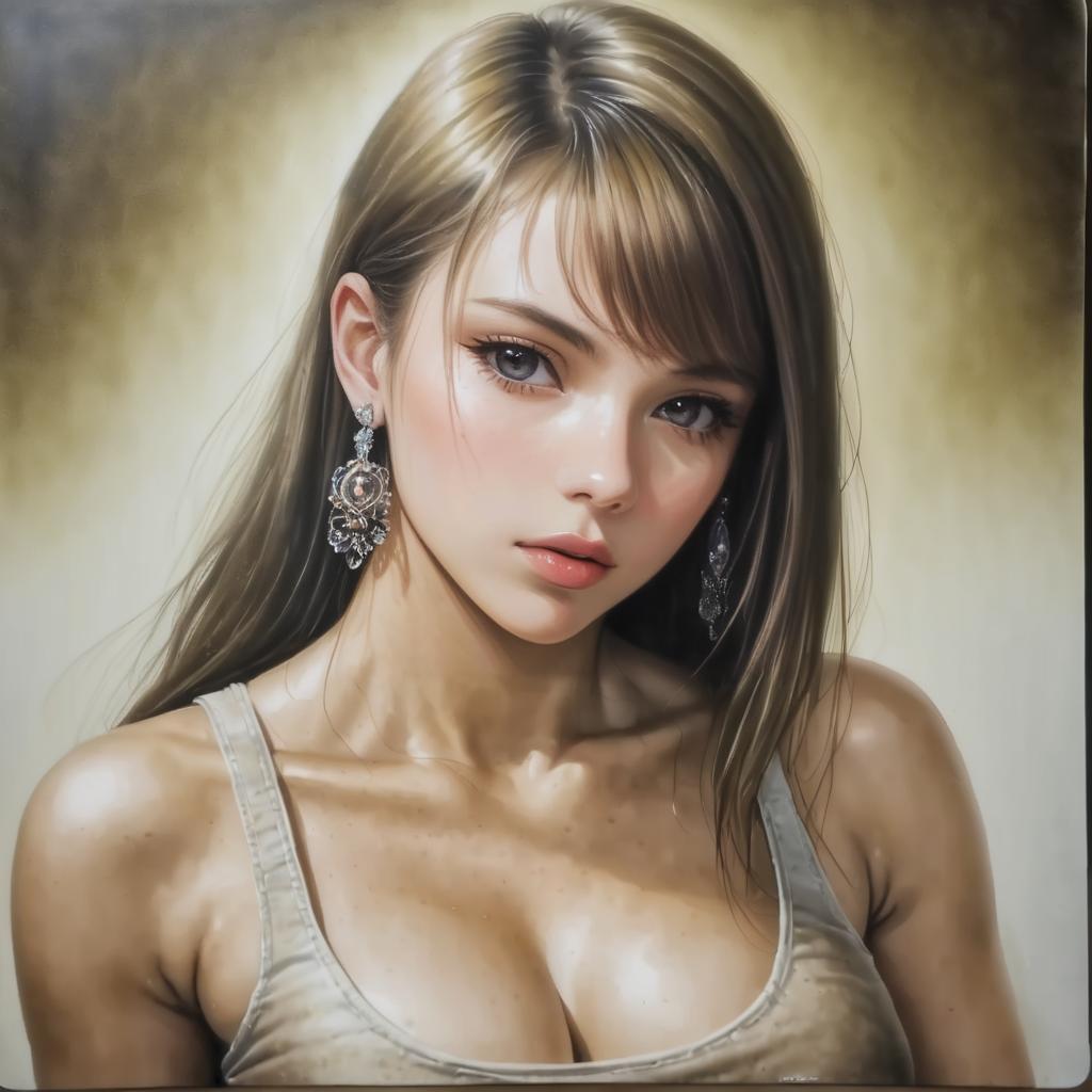 Close-up portrait of a young woman with long brown hair styled with a braid, wearing a blue tank top. She has blue-green eyes, natural makeup, and glossy lips. She is accessorized with large gold hoop earrings featuring blue geometric pendants. The image has a soft, photorealistic look with smooth skin tones and subtle lighting.