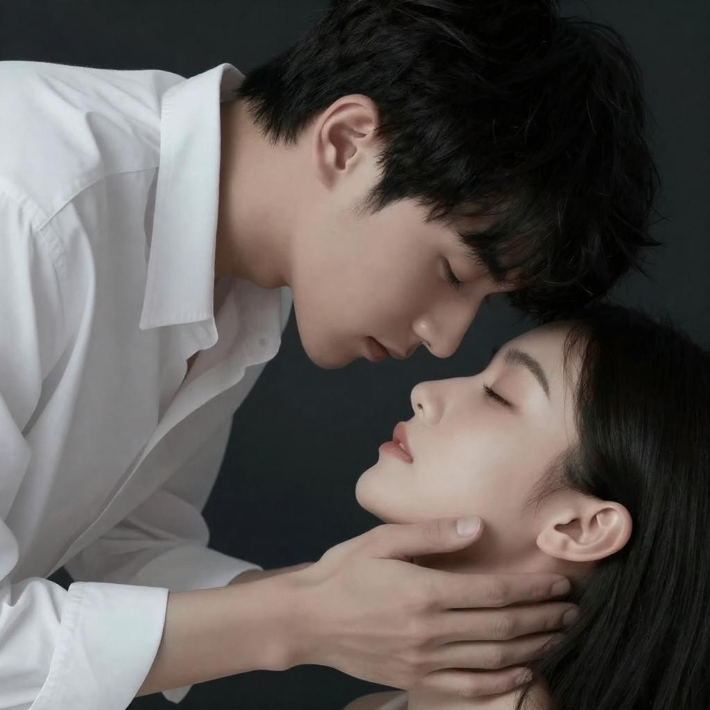 Photograph of a shirtless man with curly black hair and a woman with dark hair, face-to-face, eyes closed. Man's hands grip woman's face. Soft, warm lighting. Intimate, tender moment. Two people. Man's expression intense, focused. Woman's expression calm, receptive.