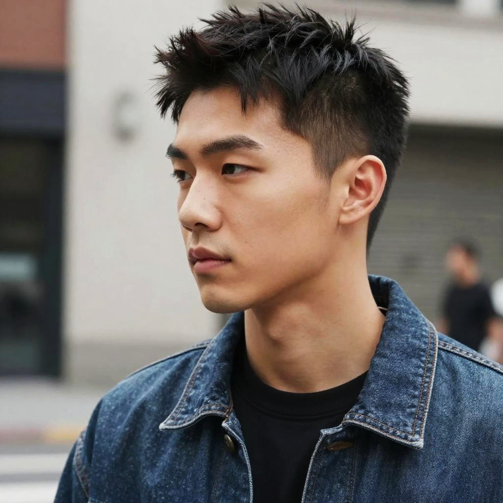 Photograph of a young Asian man with short, spiky black hair and a shaved side, profile view, wearing a black shirt and silver necklace,