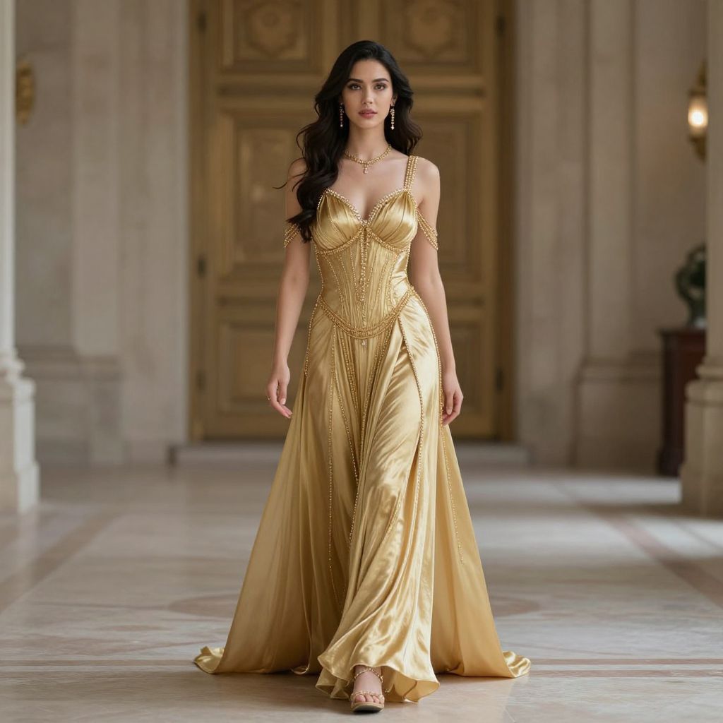 Photograph of a tall, dark-haired woman with wavy hair, wearing a golden, floor-length, strapless gown adorned with intricate beadwork and a flowing skirt. She stands confidently in the center of a grand, marble-floored hallway with ornate wooden doors in the background. The gown has a fitted bodice that accentuates her figure, and she wears a delicate necklace and bracelet to match. The lighting is soft, highlighting the sheen of the gold fabric and the elegance of the setting. Her expression is poised and serene.