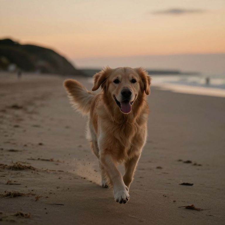 Melancholic A photography of a golden retriever running to us, tongue out, on a beach in Noirmoutier en l’Ile in France during sunset. 90s look.,