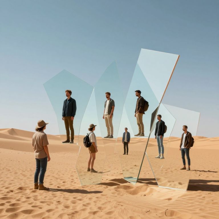 In a surreal desert landscape, fragmented mirrors distort reality, reflecting alternate versions of travelers who stand suspended between reflection and illusion, their identities blurred by the fractured truths they encounter.
