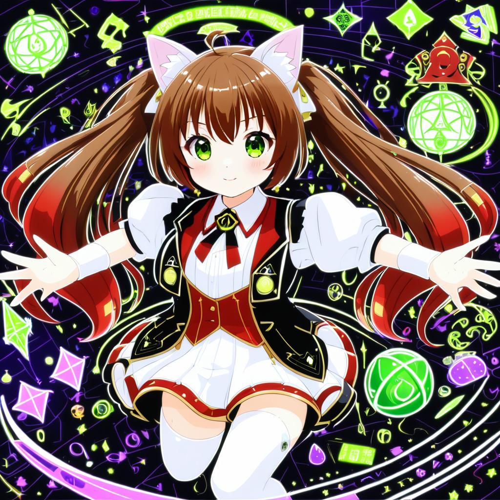 Illustration of a young anime girl with cat ears, long brown and red twin-tailed hair, and vivid green eyes, dressed in a detailed fantasy school uniform with red, black, and white accents. She wears a white blouse with puffed sleeves, a red vest, and white thigh-high socks. The background features glowing green and purple magical symbols and intricate mystical patterns, suggesting a fantasy or magical academy setting.