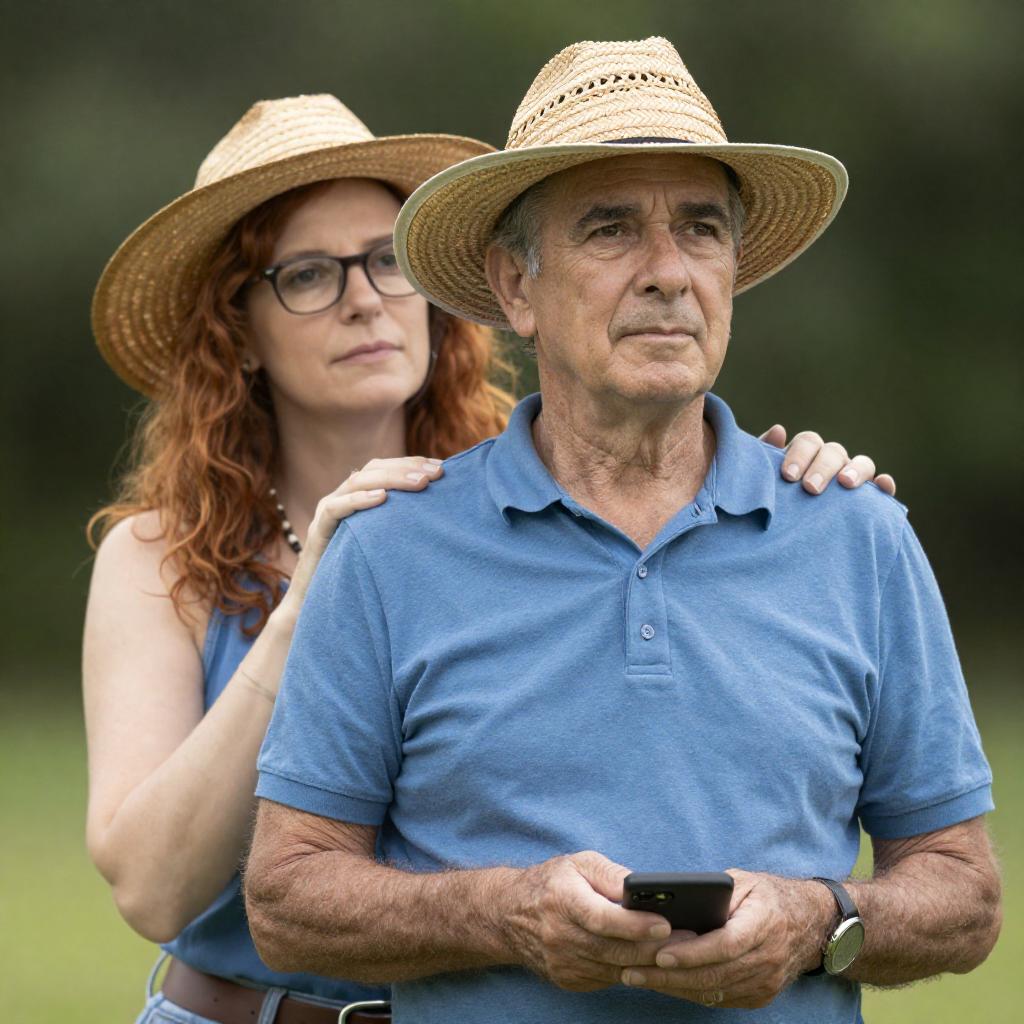 Two middle-aged men standing outdoors. Left man has dark sunglasses, curly brown hair, striped pink and orange shirt. Right man has white fedora, black sunglasses, light blue shirt, white beard. Forest and lake in background. Both wear casual clothing, facing forward. Sunlight.