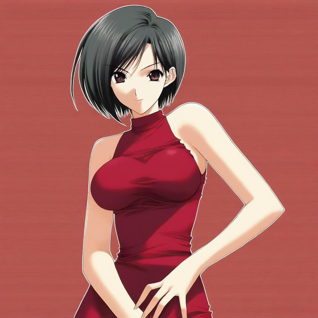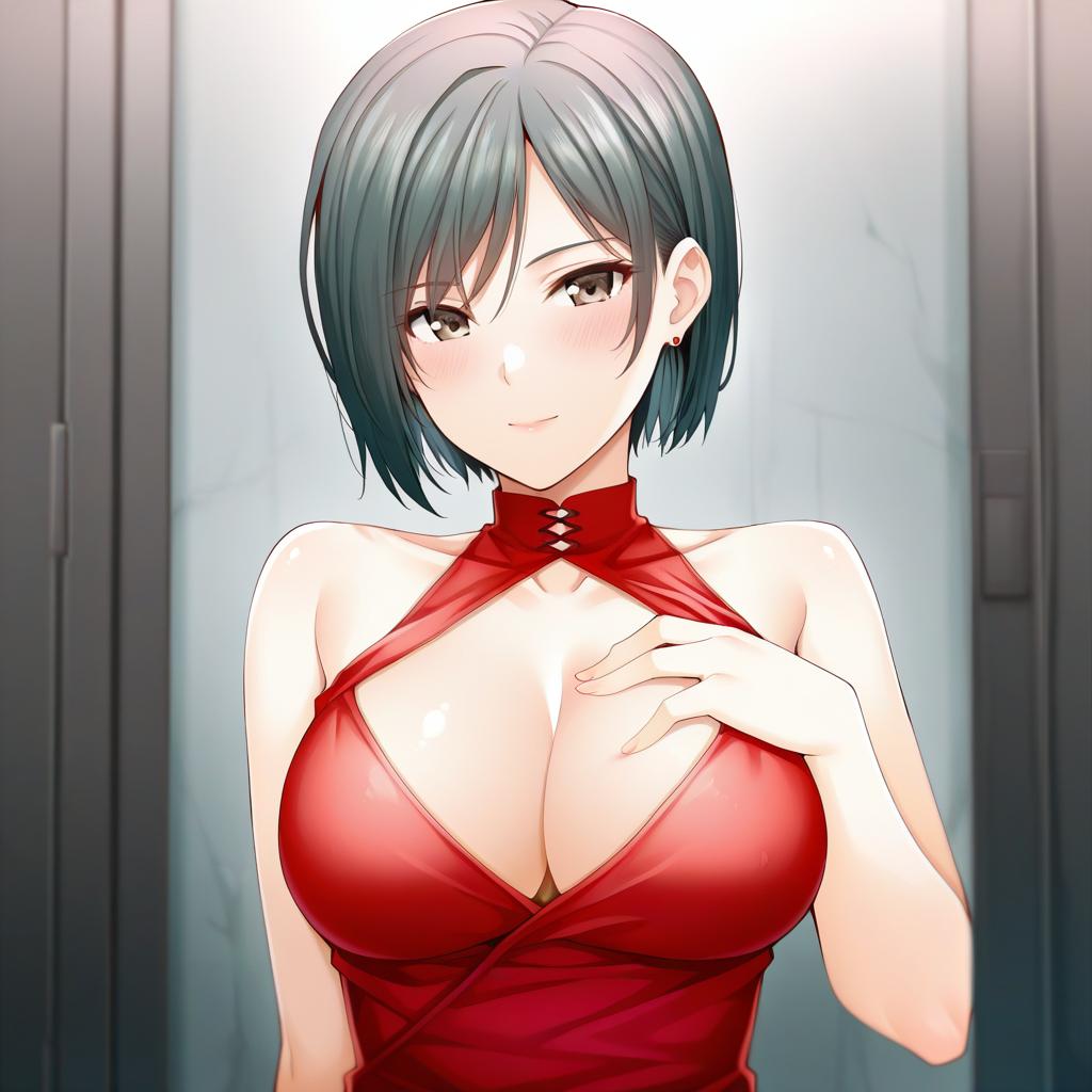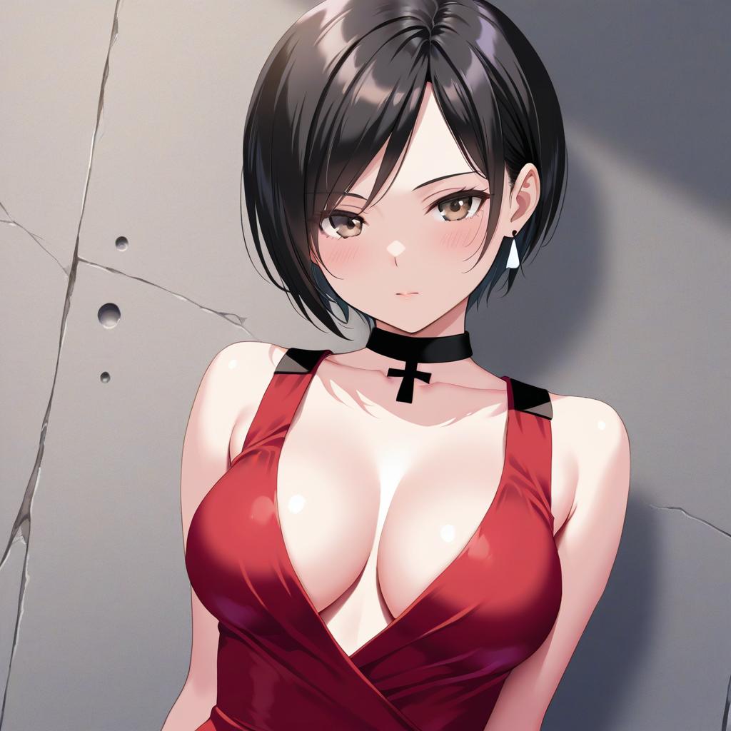 Ada wong, resident evil, 1girl, lips, brown eyes, short hair, black hair, bob cut, medium breasts, large breasts, red dress, by artist kakone, illustrious