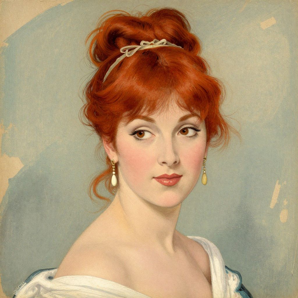 A digital portrait rendered in a classical style reminiscent of Toulouse-Lautrec, featuring a woman with vibrant red hair styled in an elegant updo, adorned with a delicate headband and earrings, set against a textured, vintage-inspired background.