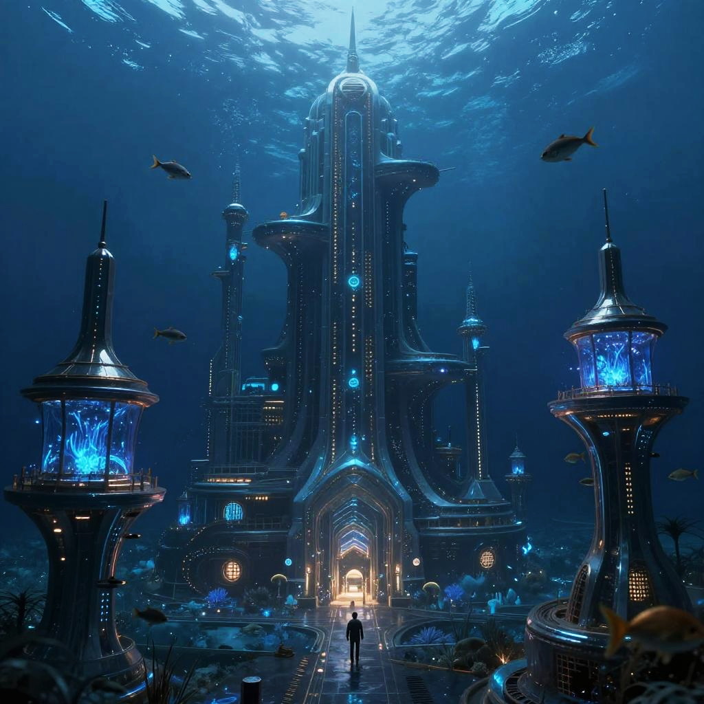 Seaart.ai inspired underwater cityscape, a vibrant metropolis beneath the sea powered by AI algorithms, glowing skyscrapers made of coral and glass, advanced submarines navigating, reflections on water surface, hyper-realistic, sci-fi ocean world