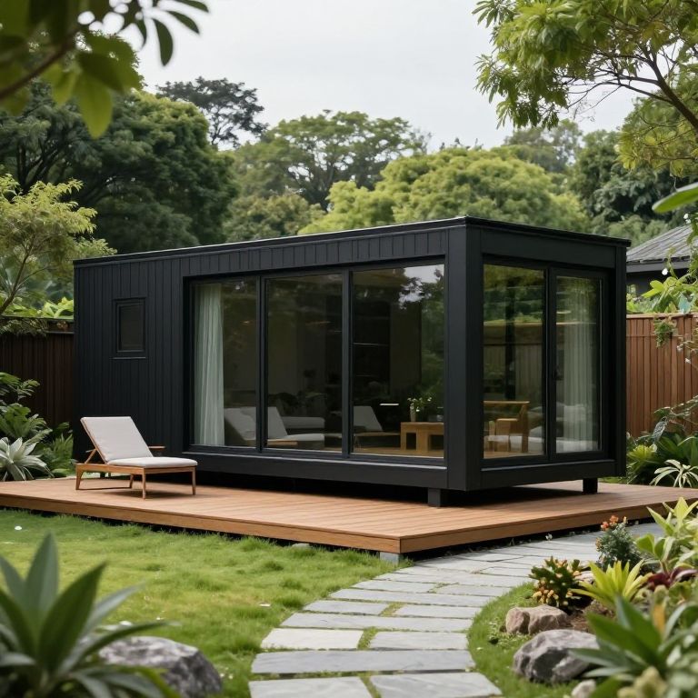 Modern modular cabins with sleek black exteriors and expansive glass windows stand in a serene outdoor setting, featuring wooden decks with lounge chairs, surrounded by lush greenery and a stone pathway leading through a tranquil garden landscape.