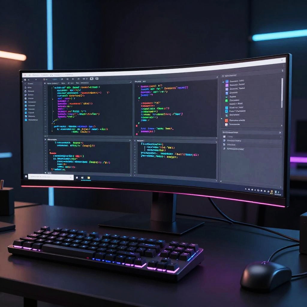 Digital art of Neovim editor on a sleek ultra-wide curved monitor, glowing neon code lines in a dark room with ambient lighting, detailed keyboard with mechanical keys, futuristic cyber coding vibe, abstract geometric shapes in background.