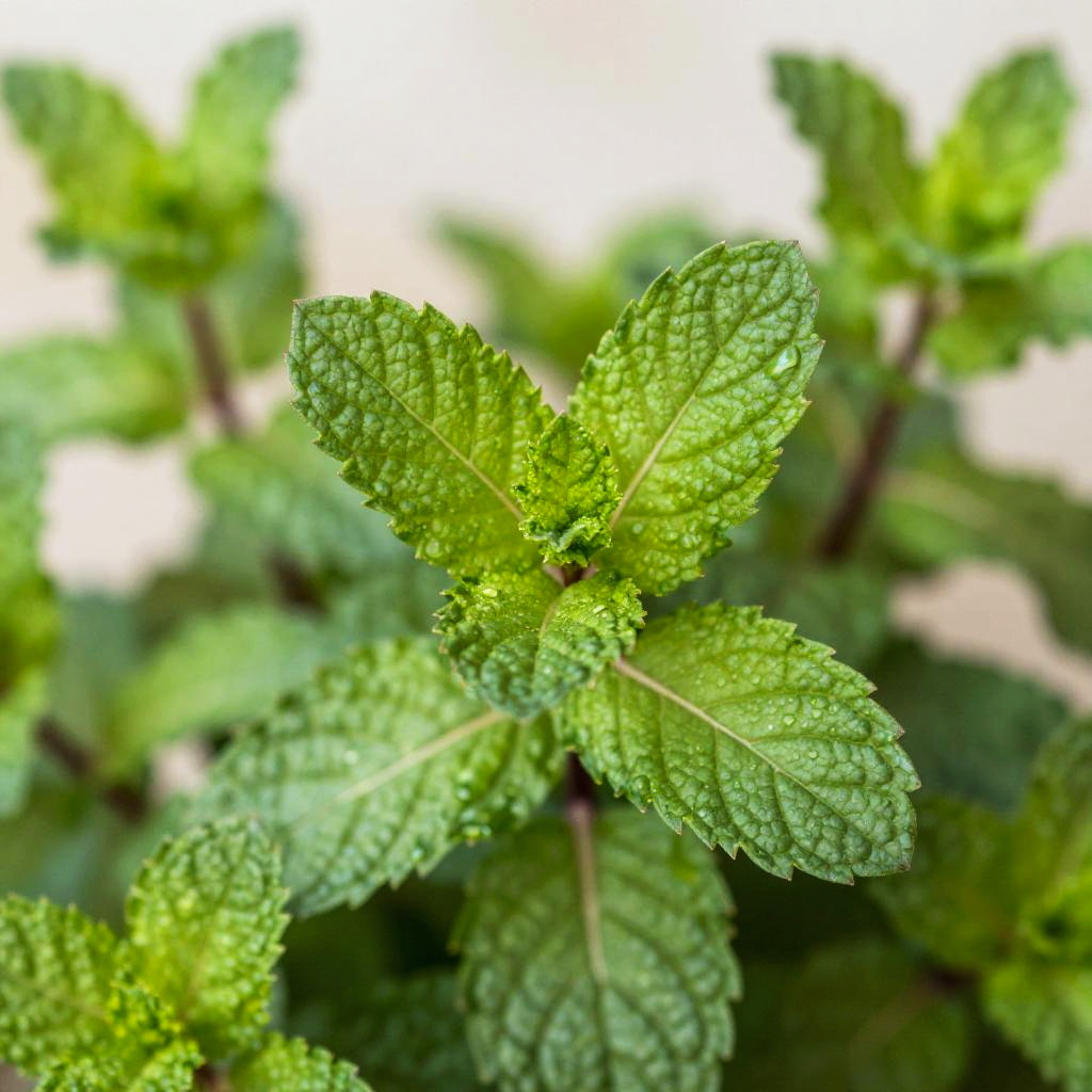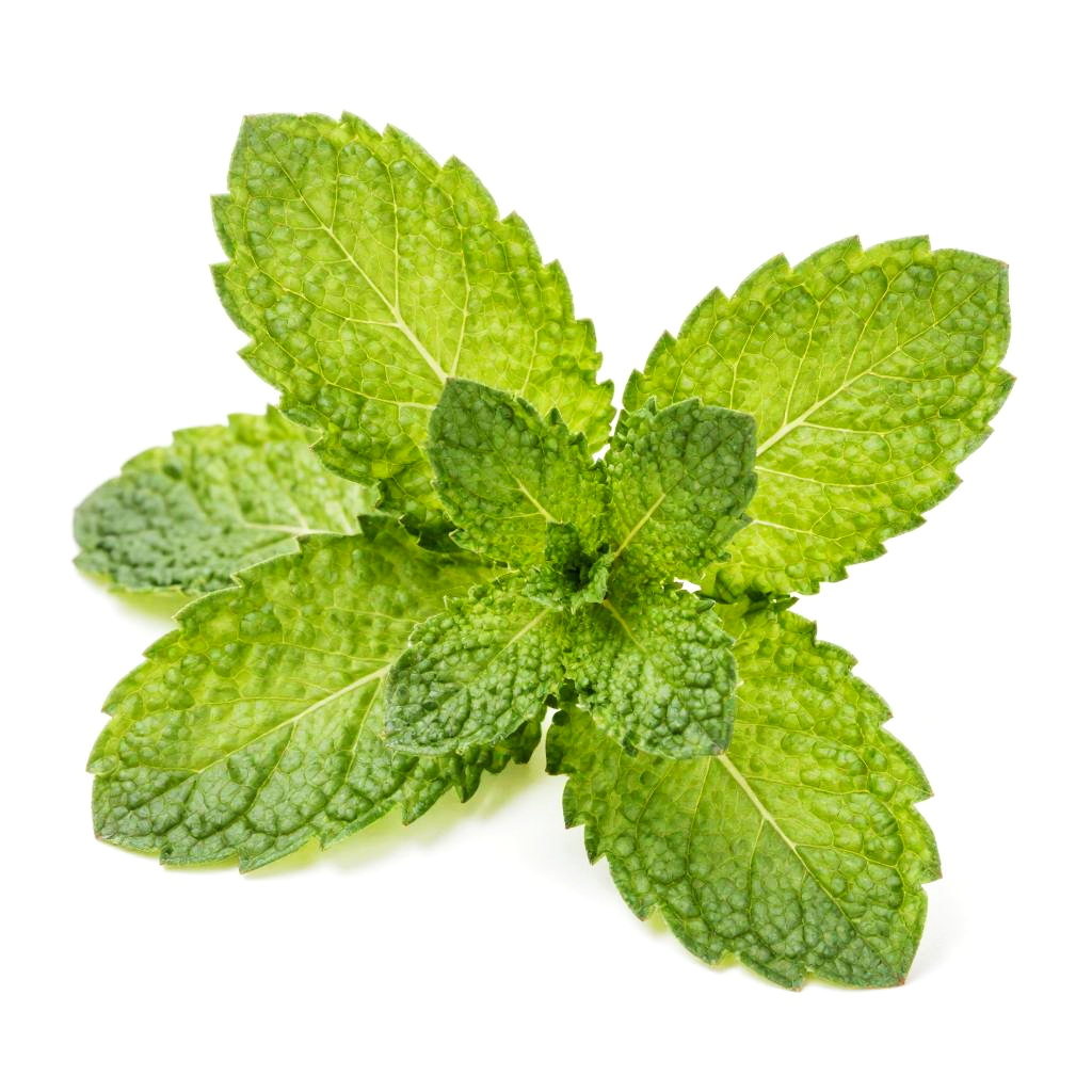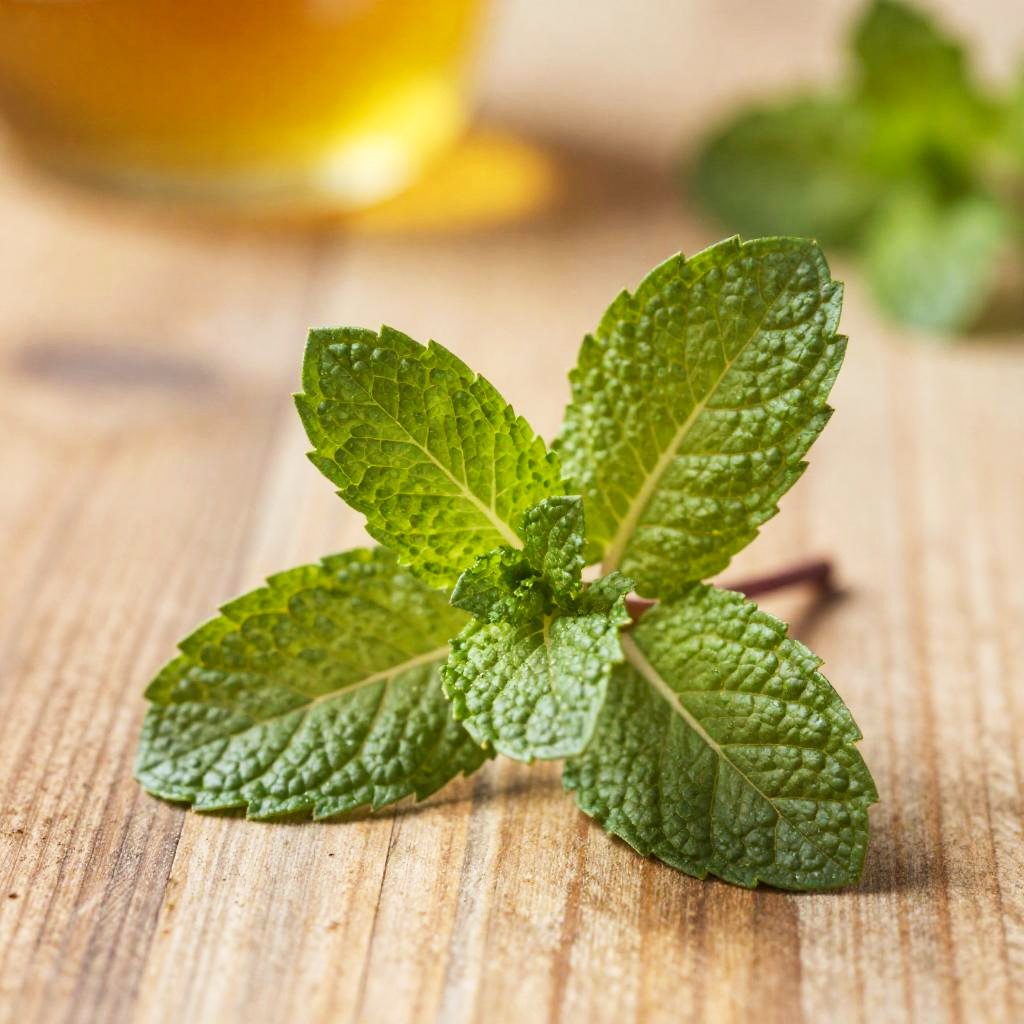 A close-up photograph of a cluster of fresh, vibrant green mint leaves with serrated edges and a slightly glossy texture. The leaves are piled on a rustic, weathered wooden surface that has visible grain and knots. The background is bright white, making the green of the mint leaves stand out even more. The image has a natural, outdoor feel.