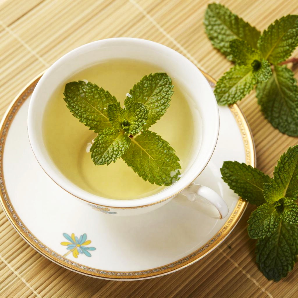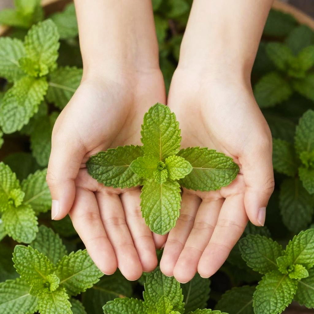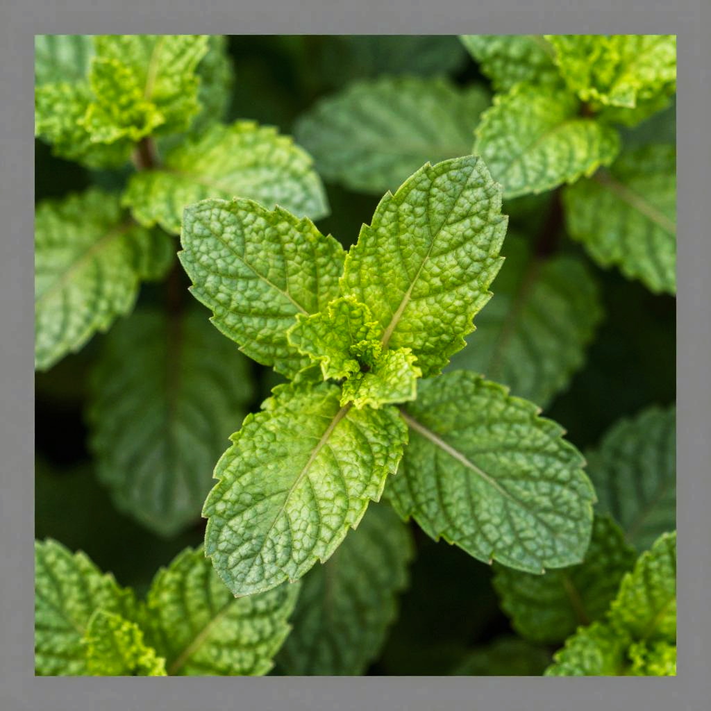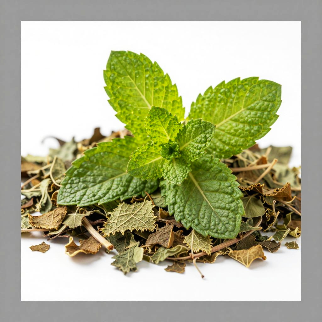 A close-up photograph of a cluster of fresh, vibrant green mint leaves with serrated edges and a slightly glossy texture. The leaves are piled on a rustic, weathered wooden surface that has visible grain and knots. The background is bright white, making the green of the mint leaves stand out even more. The image has a natural, outdoor feel.