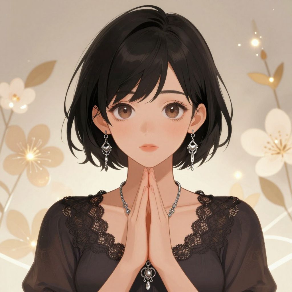 Digital anime-style portrait of a young girl with large, shining brown eyes, black curly hair, pearl earrings, and a crown, set against a soft