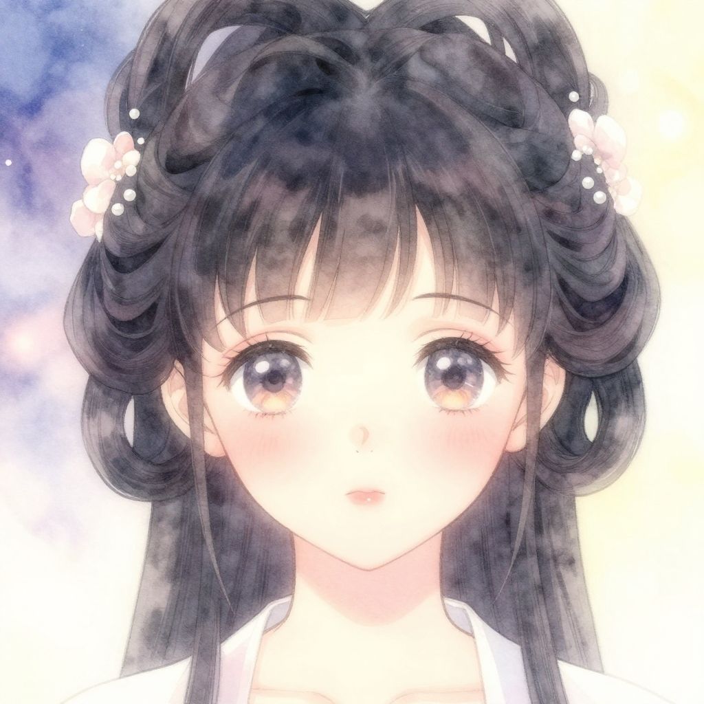 This digital anime-style portrait features a young girl with large, expressive purple eyes and pale skin. She has long, wavy black hair adorned with a small golden crown and white floral hairpins. Her hair is styled in an updo with loose curls framing her face. She wears a white collar with a pink and yellow garment visible at the bottom. The background is a soft, blurry mix of blue and white, creating a dreamy effect. The girl's large eyes and delicate features are highlighted by the bright, glowing light source from the front, giving her a gentle, almost ethereal appearance.