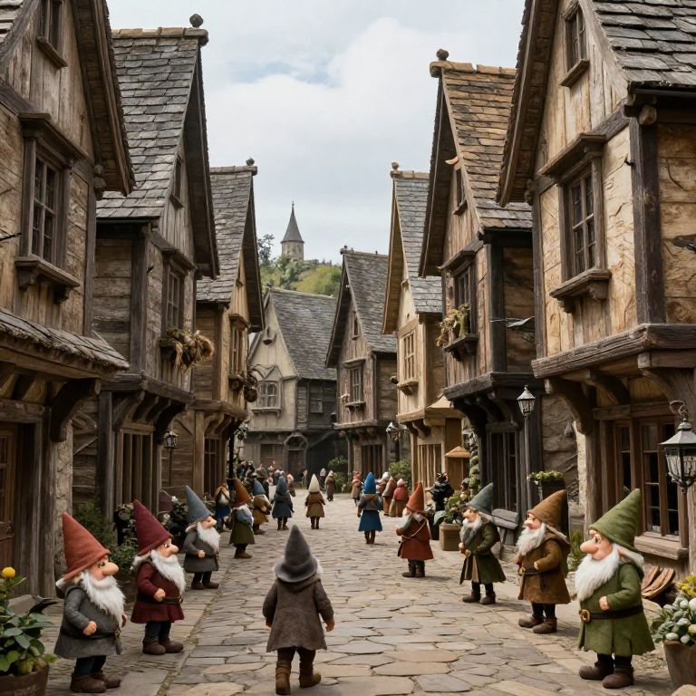 Solemn busy medieval street, poorly made buildings, crooked wooden buildings, organic street filled with gnomes halflings elfs humans, high resolution, ultra realistic, fantasy,