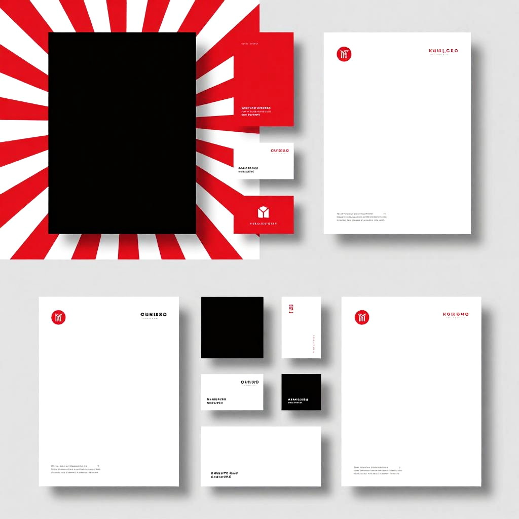 This digital graphic features a bold, geometric design with a black square at the center, surrounded by red and white radial beams, reminiscent of the Japanese Rising Sun flag. Five white business cards with minimal black text and a red circular logo are arranged around the central square. The cards' layouts vary, with some having additional small black squares. The background is plain white, enhancing the stark contrast and modern, minimalist aesthetic. The design uses clean lines and a high-contrast color palette, emphasizing simplicity and clarity.