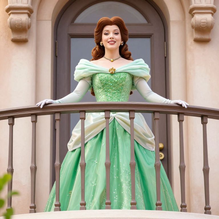 Jasmine Dress Disney, princess in a green dress standing on a balcony