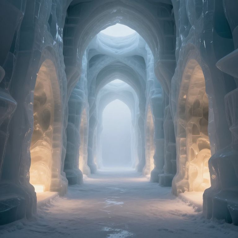 A labyrinthine corridor of otherworldly ice structures, carved with organic archways and glowing interiors, stretches into a misty horizon where light and shadow dance in harmony, defying the boundaries of natural architecture.