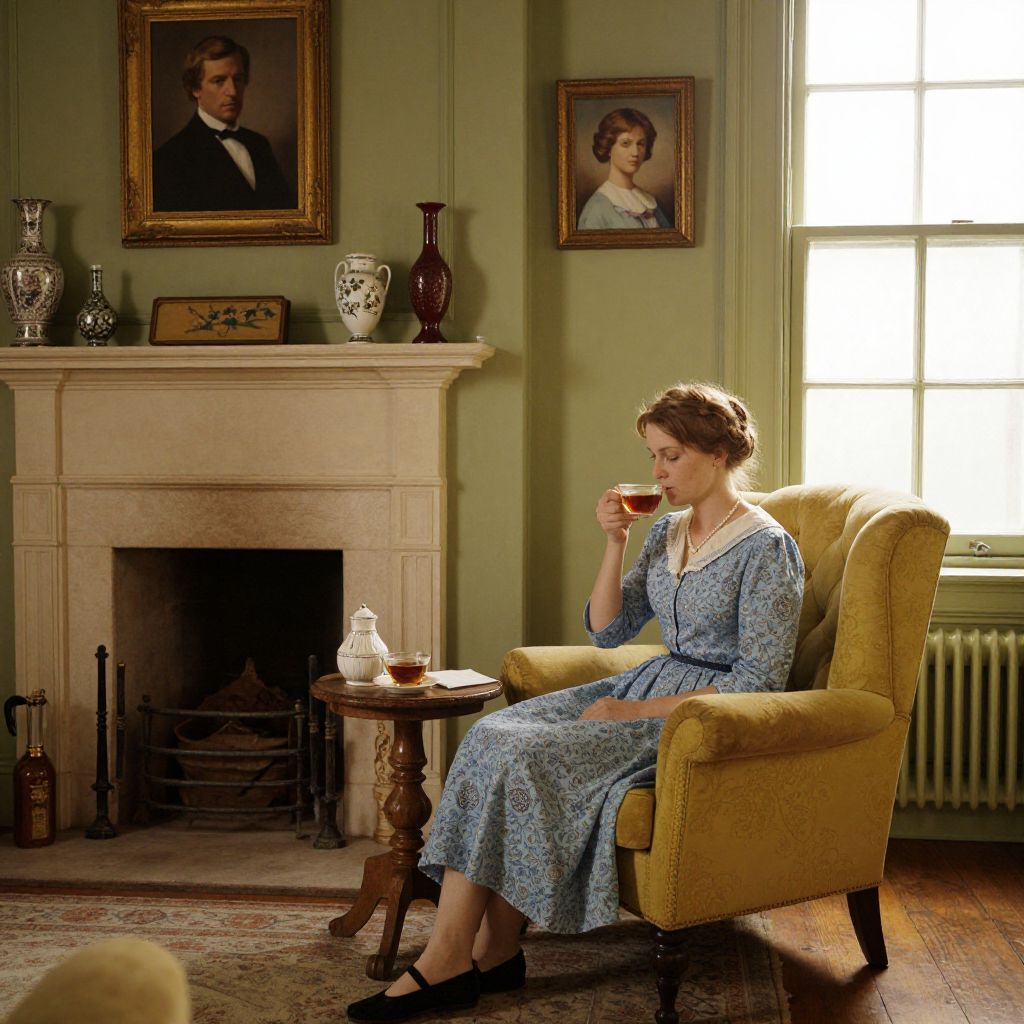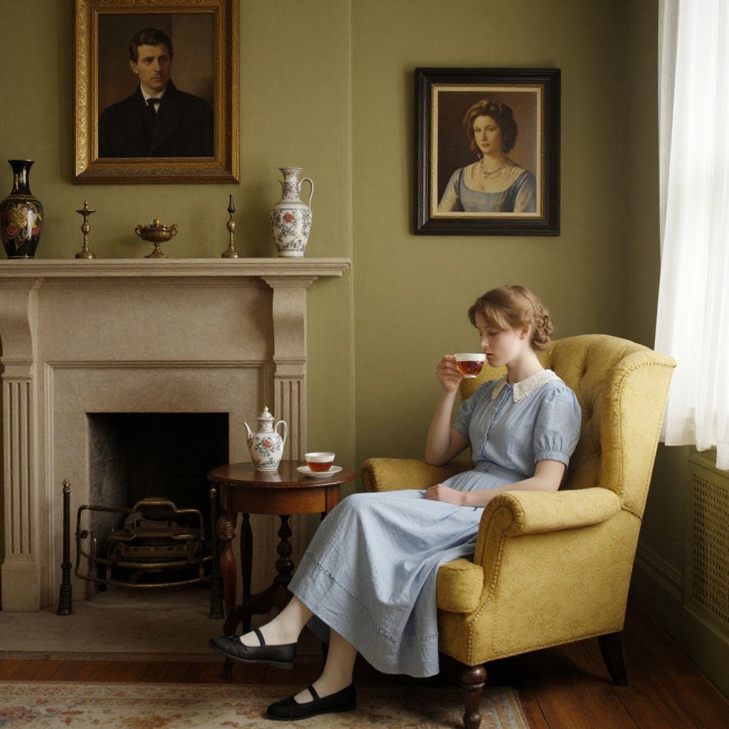 A photograph of a young woman with light brown hair in a blue, short-sleeved, Victorian-style dress, sitting in a yellow armchair sipping a cup of tea. She wears black flats. The background features a green wall with a framed portrait of a man above a beige fireplace adorned with decorative vases and a brass candelabra. Another framed portrait of a woman hangs to the right. A small wooden table with a teapot and cup sits in front of the armchair. Light streams in from a window on the right. The room has a traditional, vintage feel.