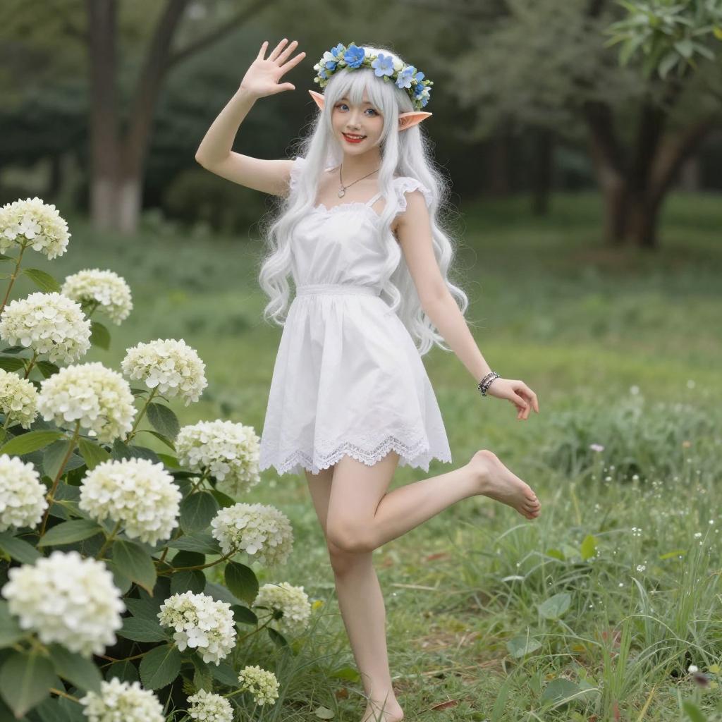Photograph of a young woman with long white hair, blue eyes, and elf ears, wearing a white off-shoulder dress and a blue flower crown. She raises her right hand, showing a gold bracelet, in a bright, modern room with wooden floors and a black staircase in the background.